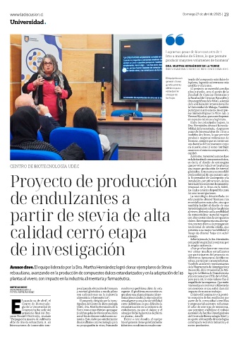 yecto Fondef ID22I10254, titulado con el fin de obtener endulzantes na- en planta», detalló del Centro de Biotecnología UdeC y