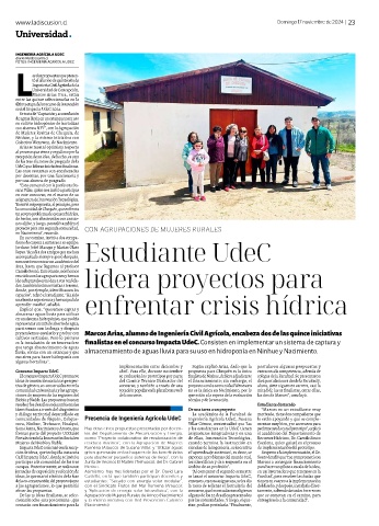 Impacta UdeC comenzó con la recep- Rumena (Arauco), de Susana Villar; y “Utilizar aguas ciencias de la ingeniería, se incentiva de implementación del prototipo.